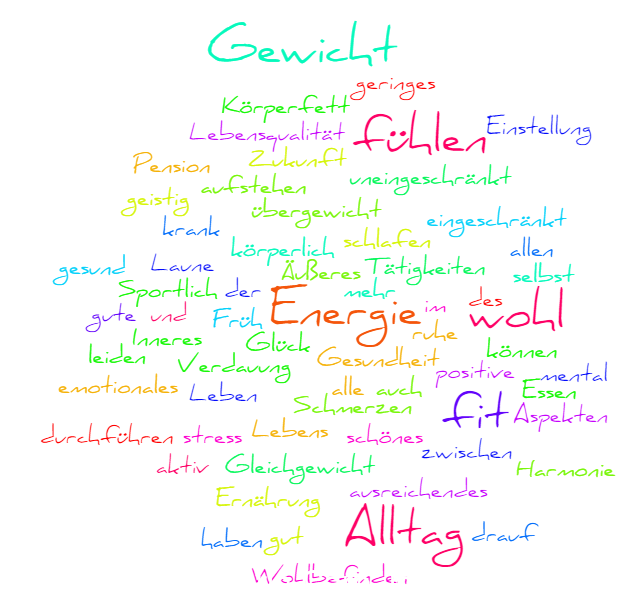 Emotionales Wohlbefinden, auch in der Zukunft ein gutes Leben haben, Glück haben, sich gesund fühlen, ein niedriges Gewicht haben, sich fettarm ernähren, ein ausreichendes Gewicht zu haben, ein reichhaltiges Essen, eine gesunde Ernährung, eine gute Verdauung, eine hohe Lebensqualität, einen guten Schlaf haben, aktiv und sportlich sein, unter keinen körperlichen Einschränkungen leiden, die täglichen aktivitäten selbstständig durchführen zu können, keine Schmerzen zu haben und nicht zu leiden.