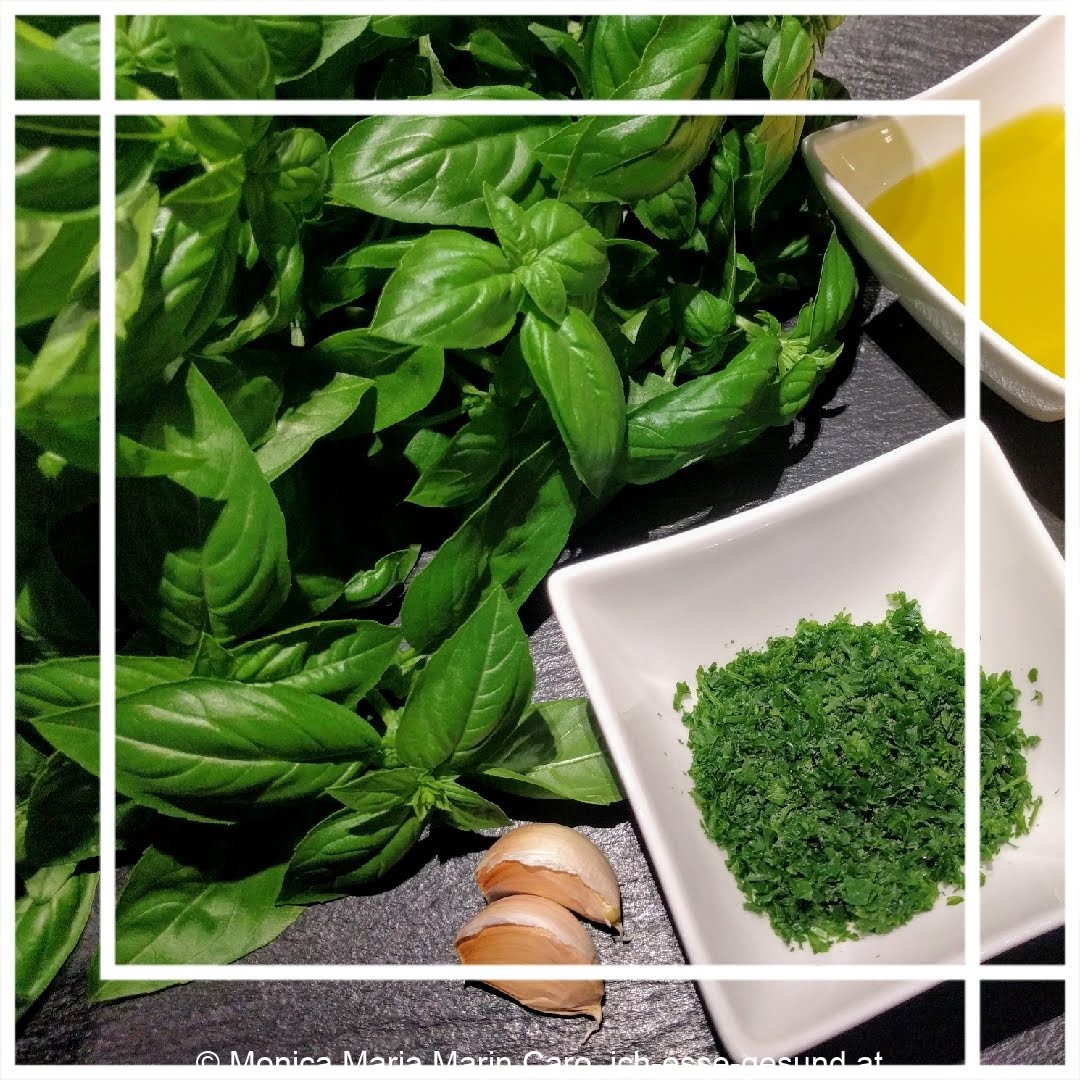 Ein wunderbares Rezept mit Basilikum ist Pesto. Das typische Pesto der italienischen Region Ligurien enthält Basilikum, Pinienkerne, Parmesan, Petersilie, Knoblauch und Olivenöl.