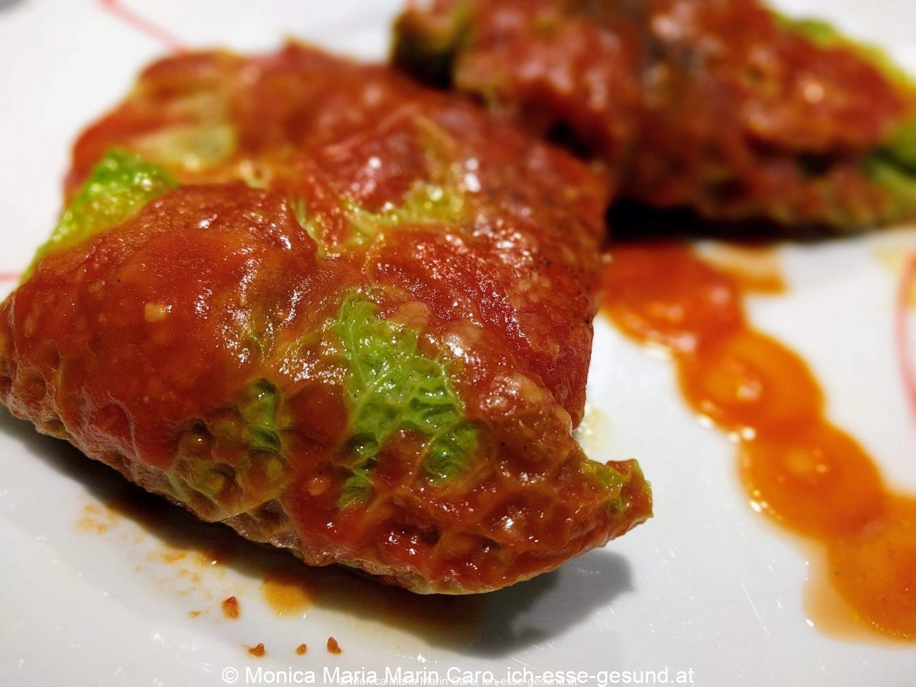 - Ein wenig passierte Tomaten in eine Auflaufform geben und vorsichtig die Kohl-Taschen darin platzieren. Ein paar EL passierte Tomaten über die Kohl-Taschen leeren und mit Parmesan und Curry bestreuen.