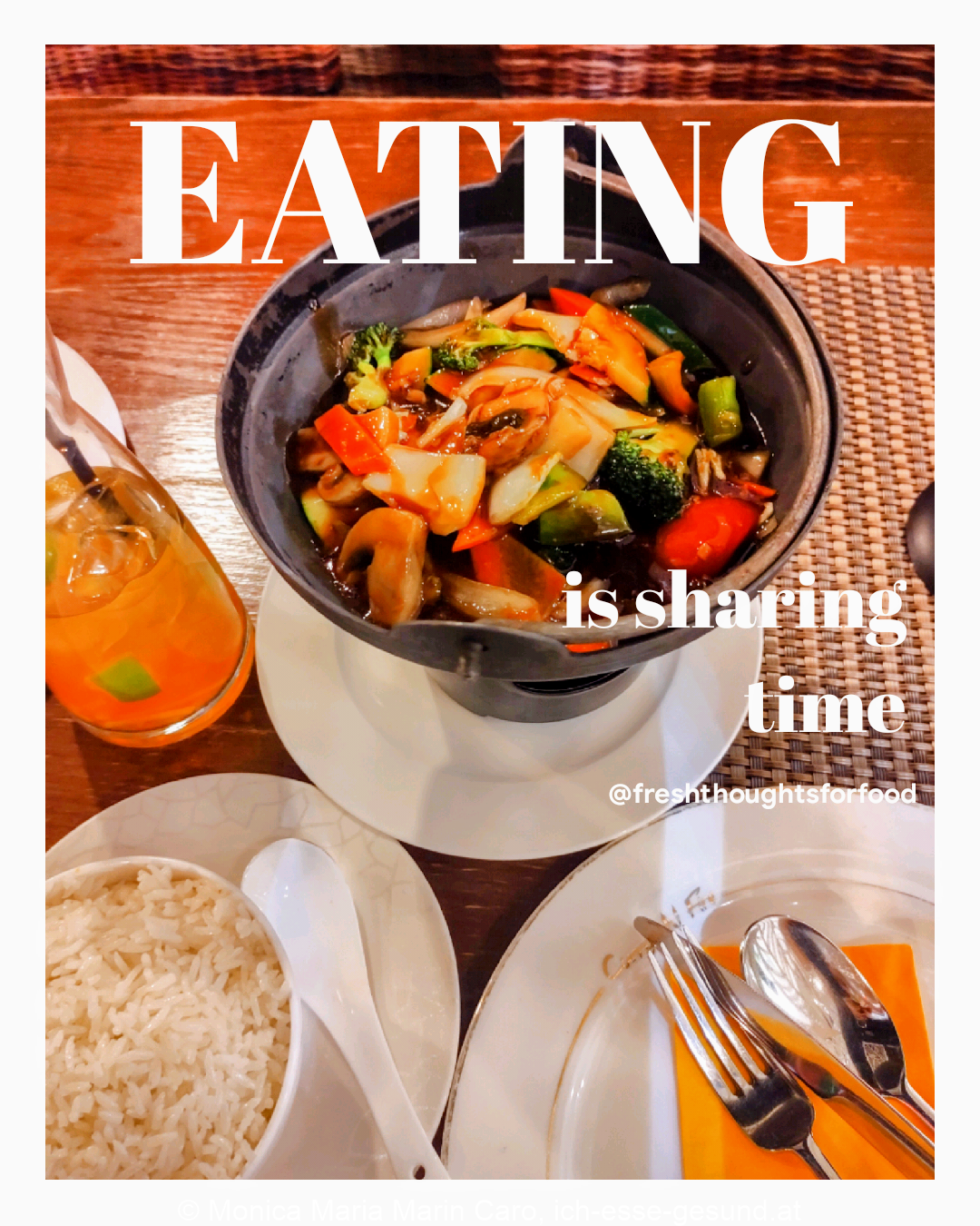 Einige der Fragen, die ich meinen KlientInnen/PatientInnen normalerweise stelle sind, ob sie alleine essen oder gemeinsam mit einer anderen Person und wo und wie sie es essen. Die Antworten sind sehr vielfältig und es gibt mir eine Vorstellung davon, wie sehr der Moment des Essens genossen werden kann und wie viel Verbindung zwischen der Person und diesem Moment besteht.