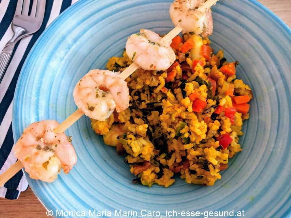 - Alle Zutaten mischen und mit Curry, Pfeffer und Salz würzen. Alternativ können die Garnelen auch auf einen Spieß gesteckt werden.